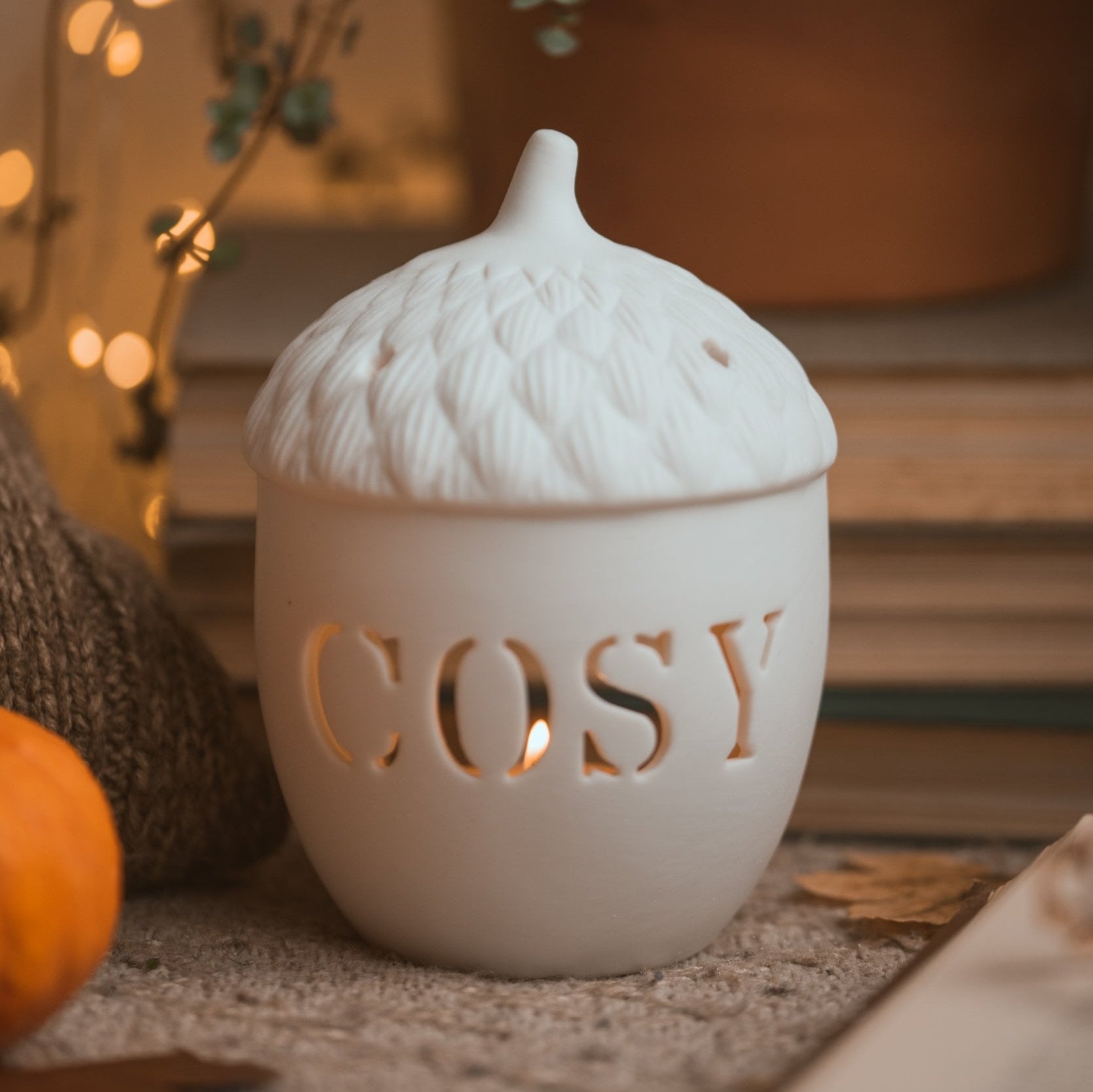Get cosy this autumn with our ceramic acorn tea light holder. 'Cosy' cut out text finishes off this understated, woodland design.